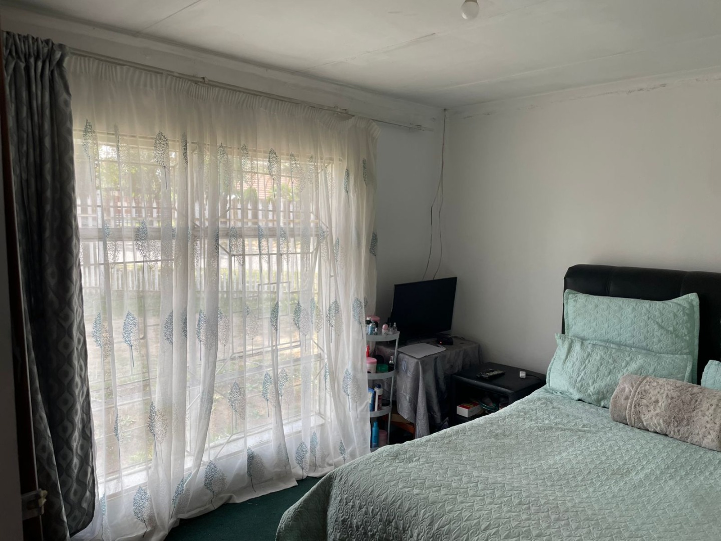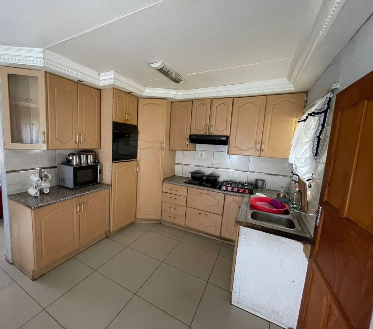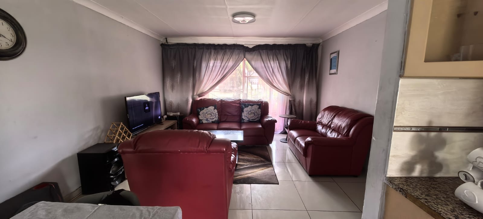 The interior features a functional layout, including a comfortable lounge area with modern tiled flooring and ample natural light. The U-shaped kitchen is equipped with light wood-toned cabinetry, an integrated oven, and a gas hob, alongside a double stainless steel sink. This space, while currently dated, offers a practical foundation for contemporary upgrades. Accommodation comprises three well-proportioned bedrooms and a single bathroom, providing essential amenities. Security is enhanced with burglar bars on windows, ensuring peace of mind.